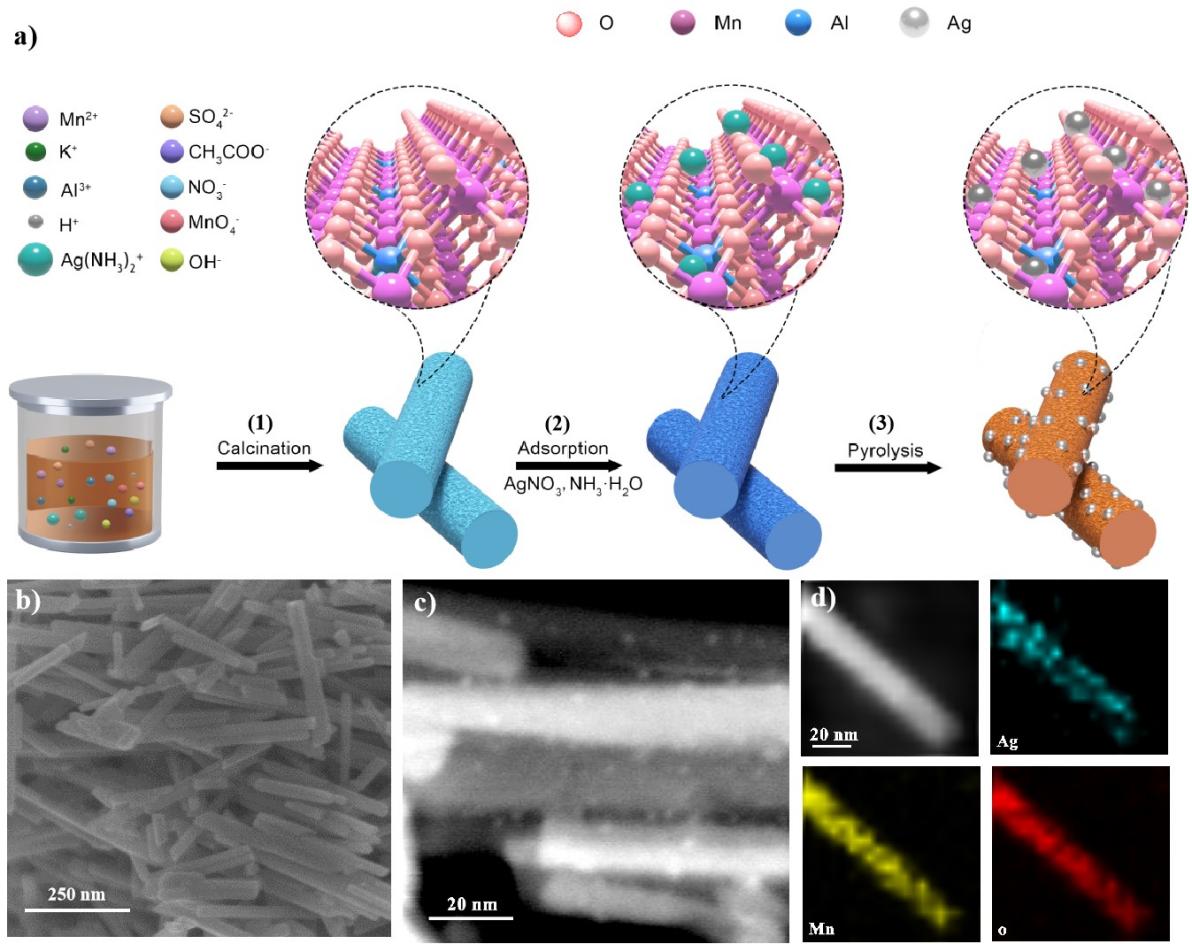 传统乙烯环氧化催化剂Ag负载量高(10wt.%以上),主要通过添加促剂(Cs、Re、Cu、Au)提升环氧乙烷选择性,然而这样往往牺牲了乙烯的转化率。本研究中通过Al修饰的Ag/Al-MnO2催化剂,在较低的Ag负载量条件下(2.5wt.%),实现了常压温和条件的高环氧乙烷产率。本征活性(TOF值)相比于传统Ag NPs/α-Al2O3和未修饰的Ag/MnO2催化剂提高了48倍和13倍。