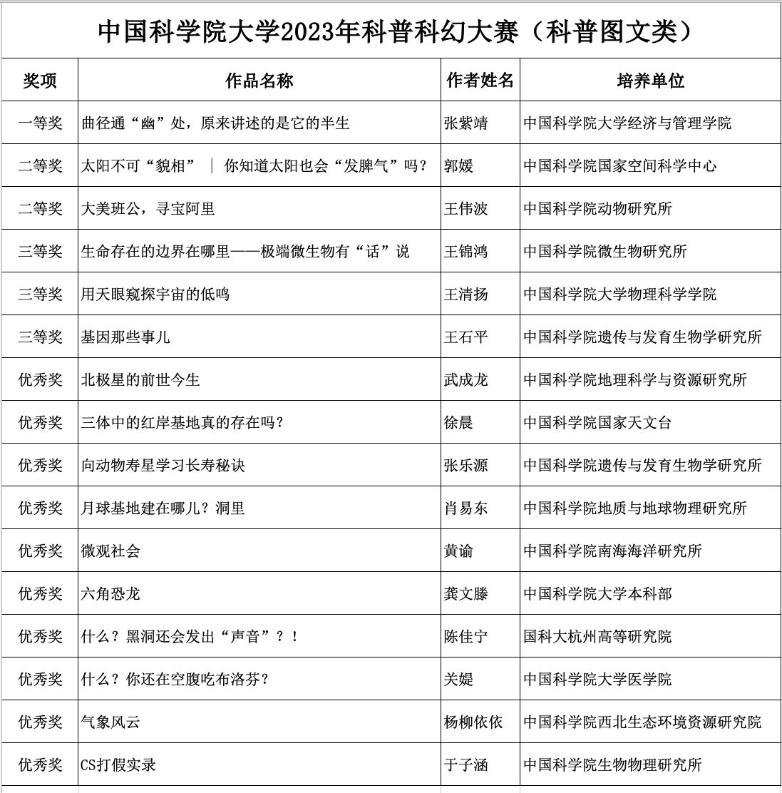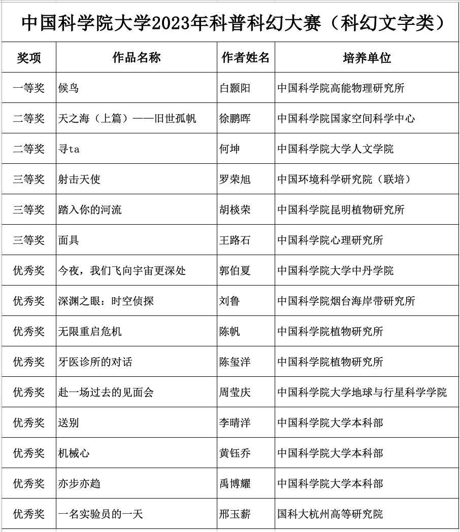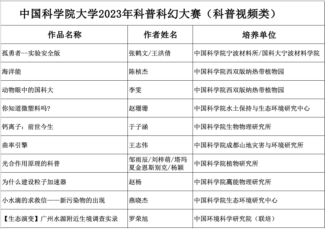 大赛邀请多位科普作家、科幻作家、科普影视专家、短视频平台相关负责人担任评委,最终评选出一等奖作品3个、二等奖作品6个、三等奖作品9个,优秀奖作品23个。获奖者请留意邮箱后续通知。